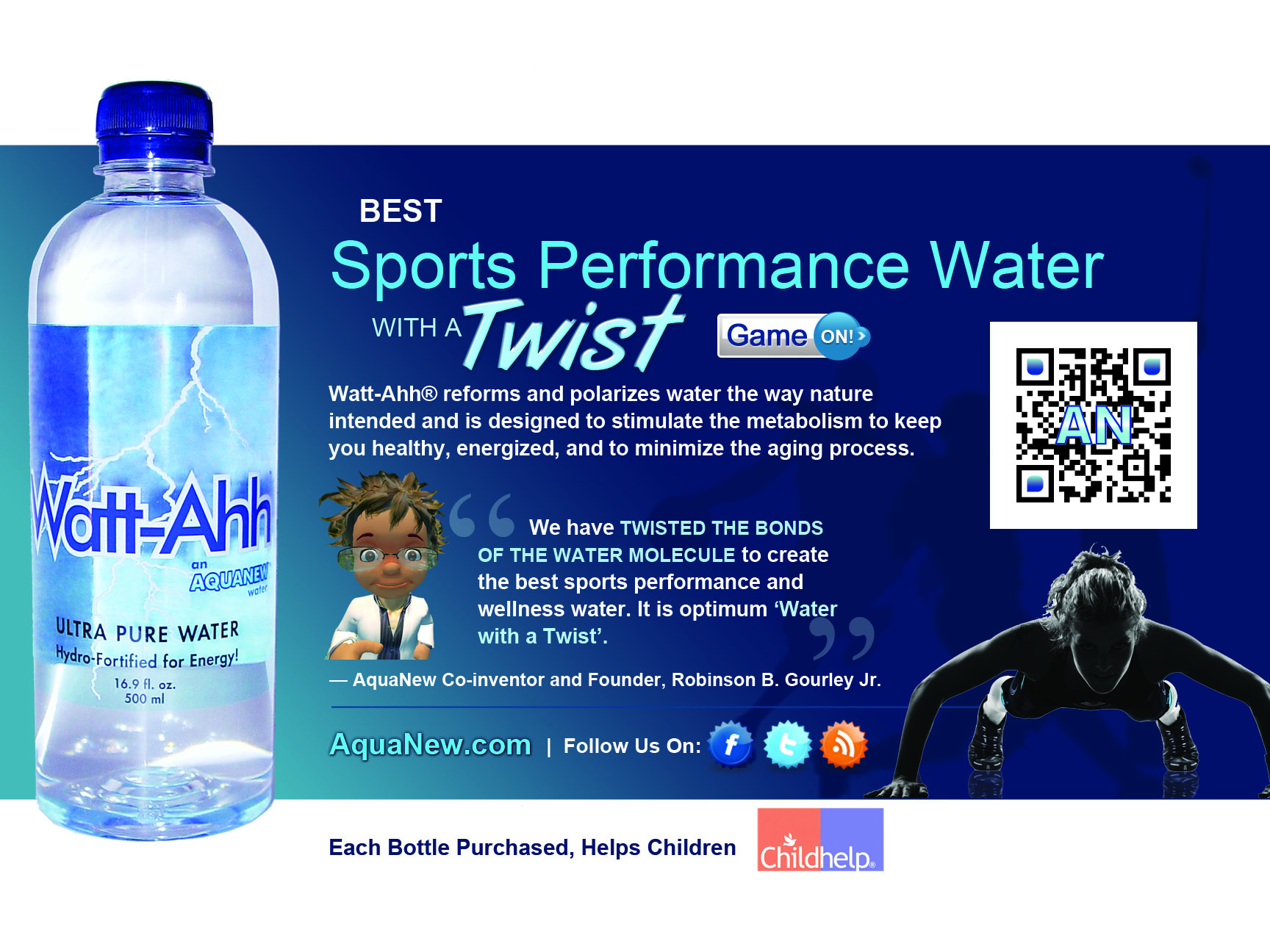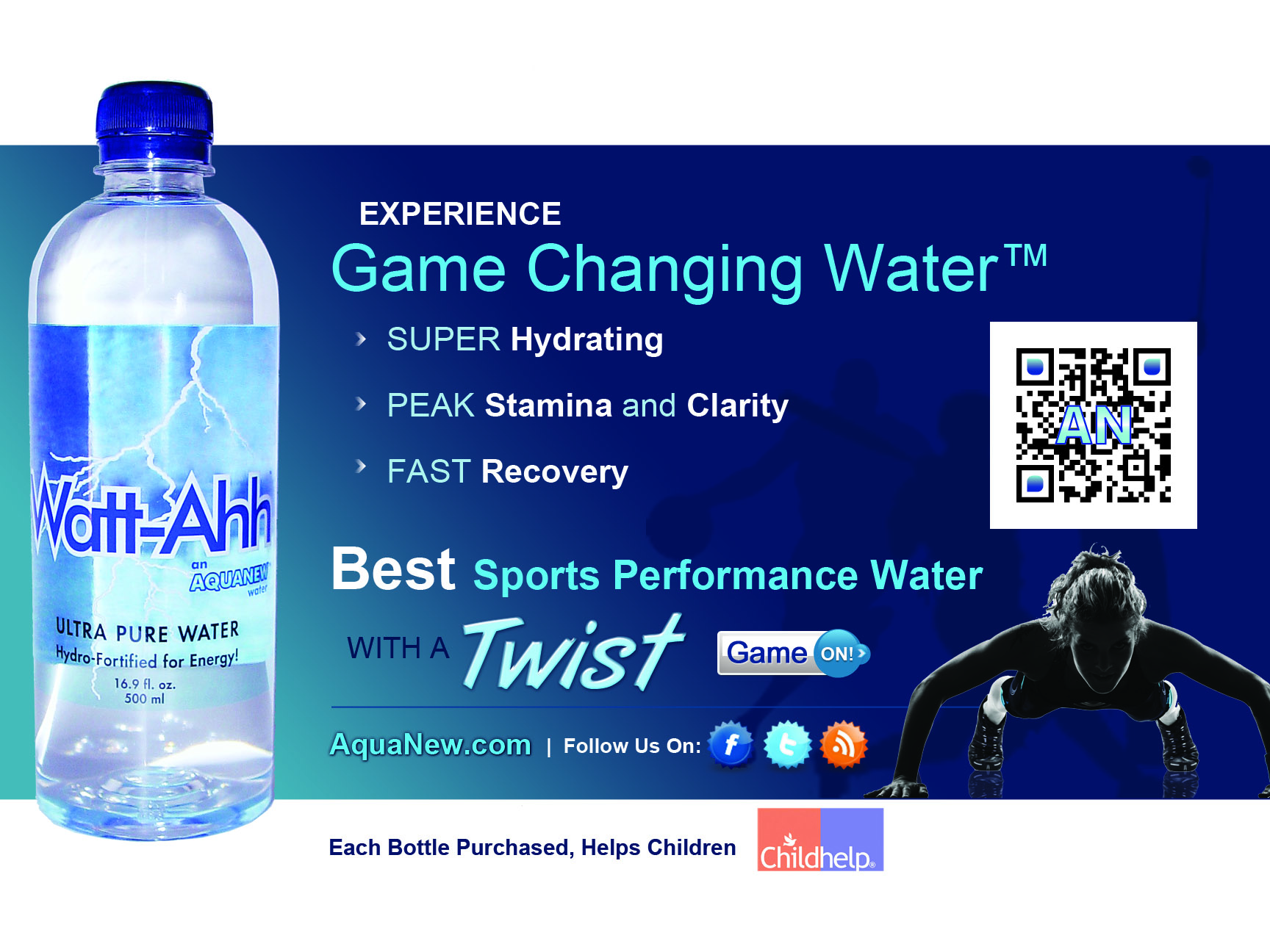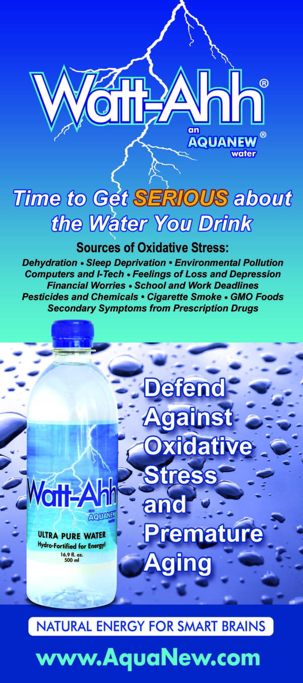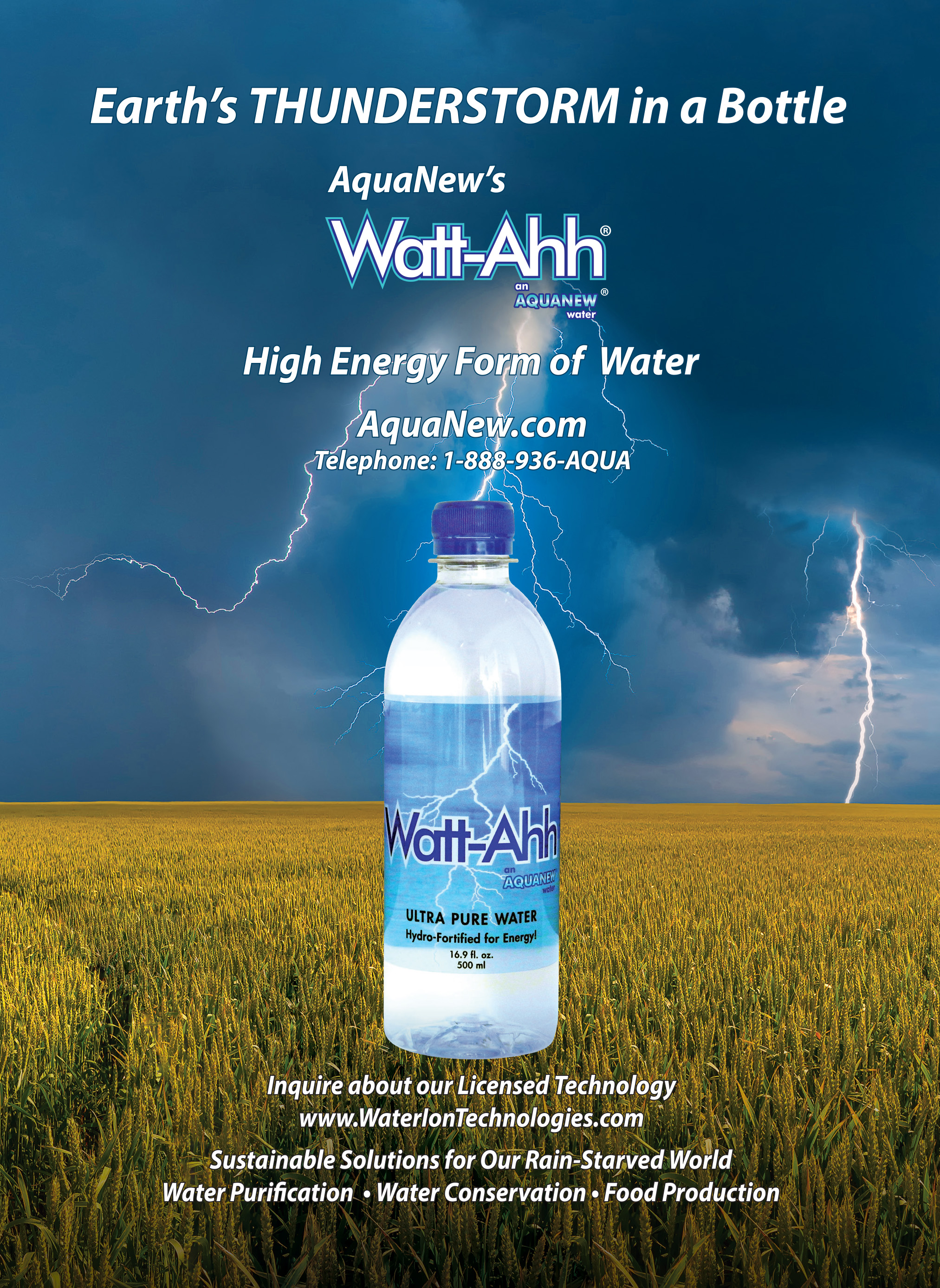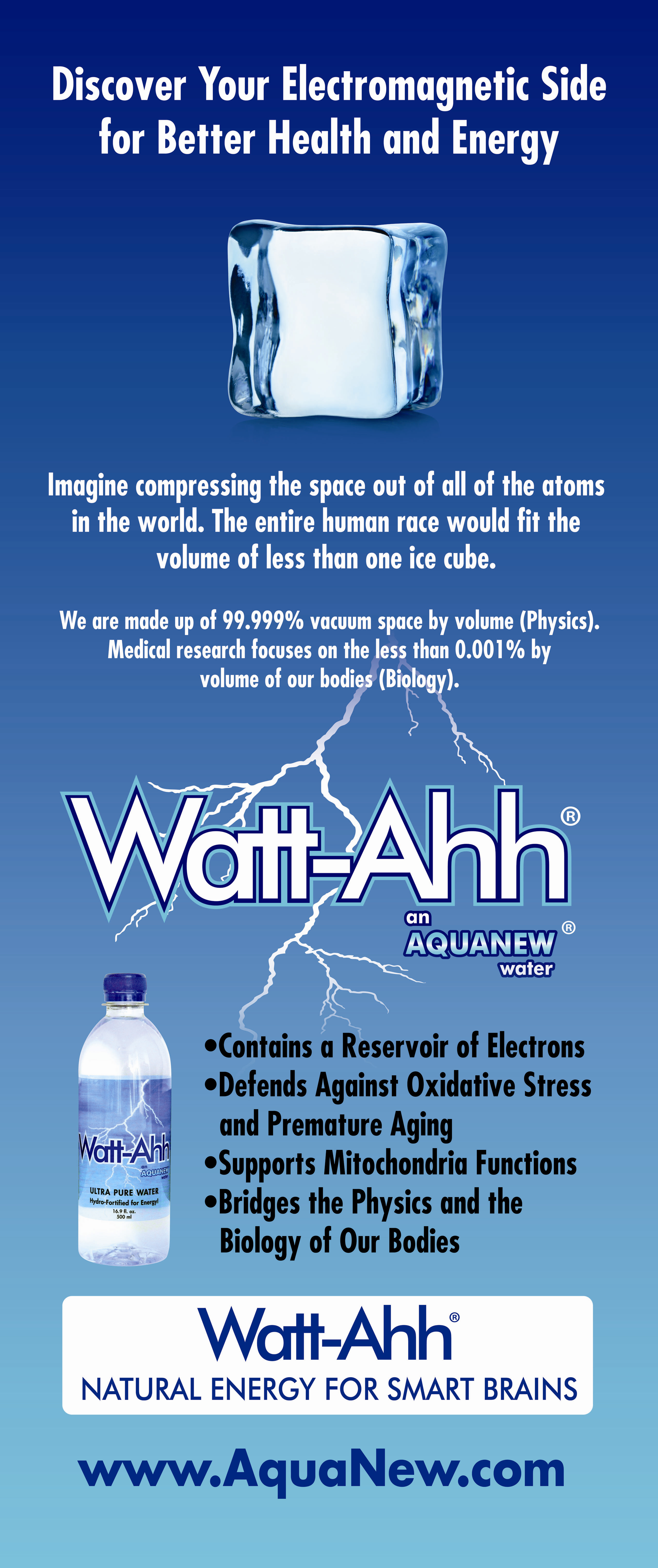 Watt-Ahh® - Natural Energy for Smart Brains Watt-Ahh® is the high energy form of ultra-pure water. It is 100% water without any sugars, caffeine or additives. Watt-Ahh® is crisp, refreshing, clean…healthy. University studies continue to prove Watt-Ahh® is the Best Sports Performance Water that gives superior hydration and fast recovery for the athlete that is in all of us. Watt-Ahh® is available in Southwestern Florida and is shipped throughout the United States. Watt-Ahh® - Natural Energy for Smart Brains. Our MissionAquaNew celebrates well-rounded lifestyles, athletic prowess, scientific discovery, and we support those in recovery. We respect the legacy of nature-based solutions and bravely seek with others the new horizon for sustainable health and immunity. We offer ultra-pure Polarized Water to those with busy lives who are discerning about their health, willing to share their own incredible life journey, and have optimism for the future. This inclusive, common-ground approach is simply stated – “Be the Ahh!” More InformationSUBSCRIBE to our Weekly e-newsletter (view sample issue) Technical Water Information for Media Articles: AquaNew has acquired a library of technical information on the topics of water and hydration. Please email inquiries@AquaNew.com or call